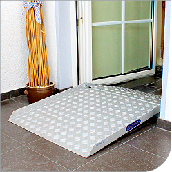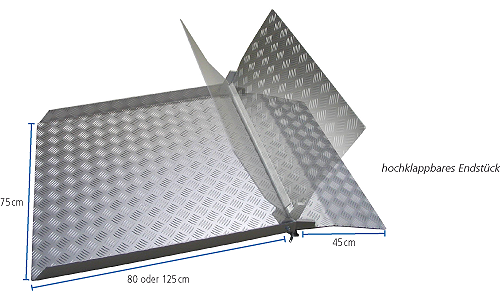 Mit dem hochklappbaren Endstück eignet sich diese Rampe hervorragend für das dauerhafte Beseitigen von Hindernissen in Eingangsbereichen:
