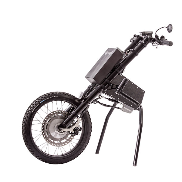 Das dynagil AC ist eine elektrische Zughilfe für Rollstühle in Aluminium-Leichtbauweise (Verladegewicht ohne Akku 14kg). Der 24V Nabenmotor ist in einer 20“ Felge verbaut. Er lässt eine Höchstgeschwindigkeit von 6 km/h zu und wird von einem leistungsfähigen LiFePo4-Akku gespeist.