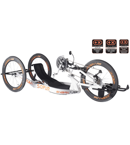Das innovative Rahmendesign des Handbikes SOPUR Shark RS ermöglicht beste individuelle Positionierung. Der Rahmen umschließt den Fahrer. Dort, wo die Kraft eingeleitet wird, wird sie direkt in Vortrieb umgesetzt. Ein tiefer Schwerpunkt und breiter Radstand ermöglichen hohe Kurvengeschwindigkeiten bei maximaler Stabilität.