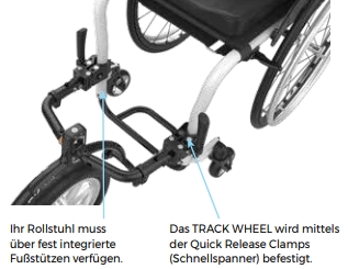 Das Track Wheel wurde für maximale Stabilität für Rollstühle mit fest integrierten Fußstützen entwickelt und ist daher mit zweifacher Klemmvorrichtung ausgestattet.